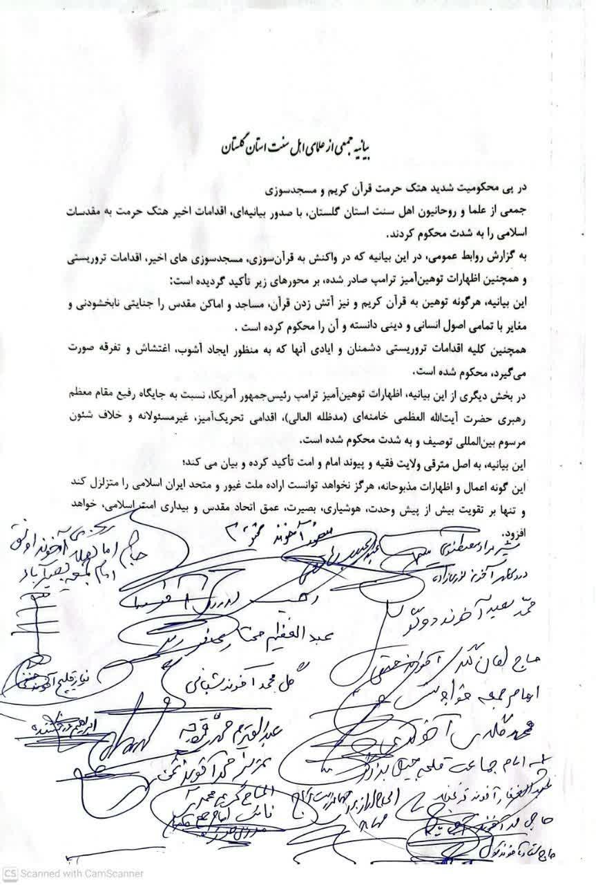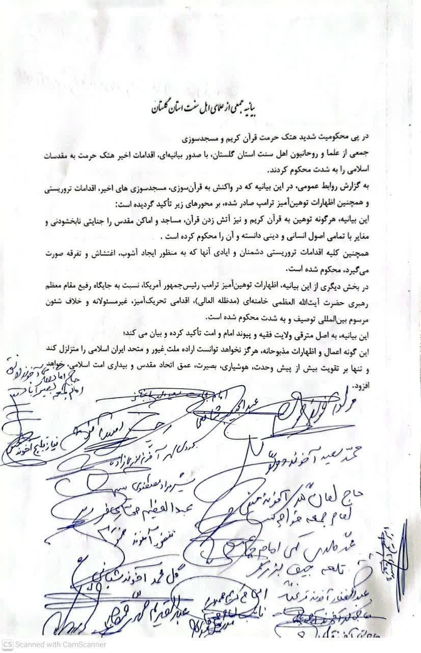 جمعی از علما و روحانیون اهل سنت استان گلستان، با صدور بیانیهای، اقدامات اخیر هتک حرمت به مقدسات اسلامی را به شدت محکوم کردند.