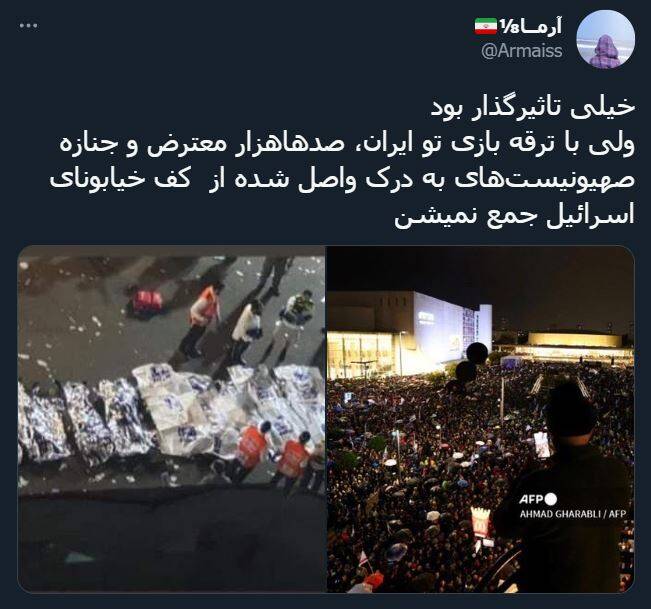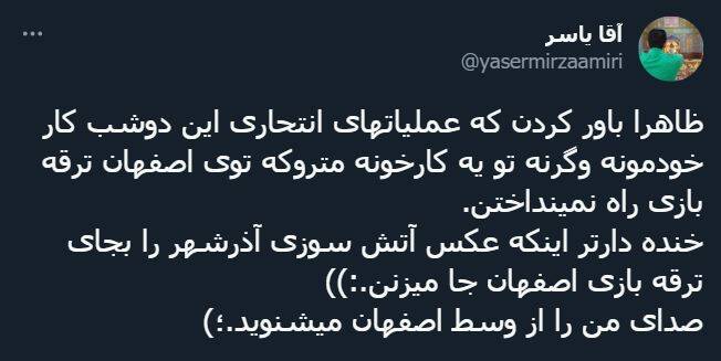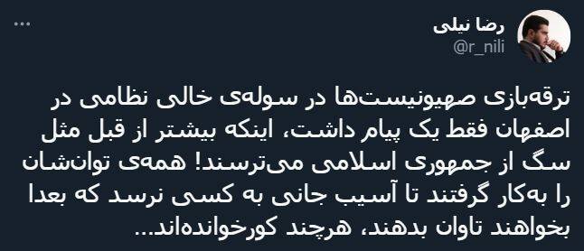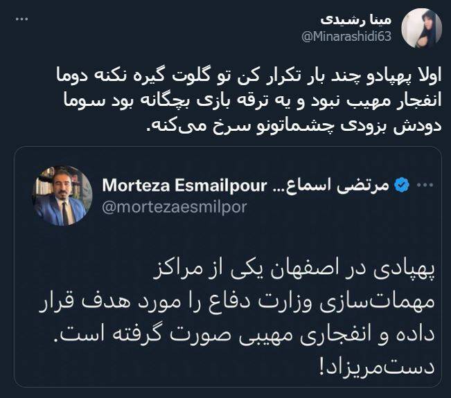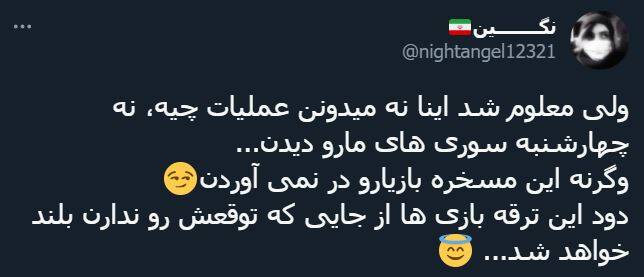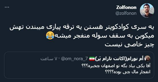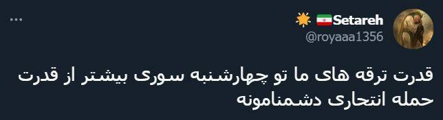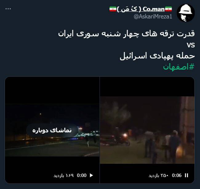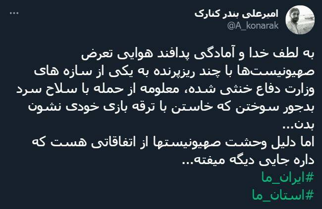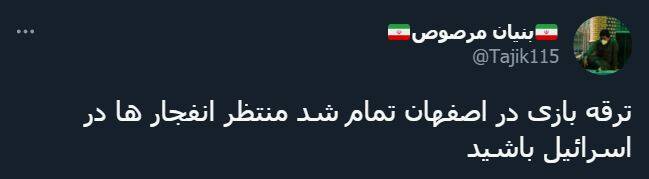 در ادامه کاربران مطرح کردند که این اقدام در پی انتقام گیری رژیم صهیونیستی از حوادث و اعتراضات داخلی خود بوده که آن را بی اثر و بی نتیجه خواندند. در ادامه واکنش کاربران به حوادث شب گذشته اصفهان را مشاهده می کنید.