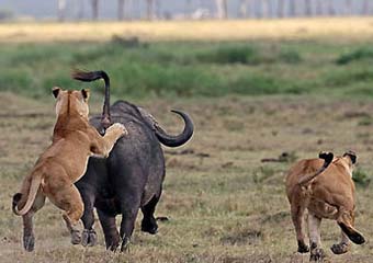 یک بوفالو که وارد قلمرو شیرهای وحشی شده بود، به طرز معجزهآسایی زنده ماند و توانست فرار کند.