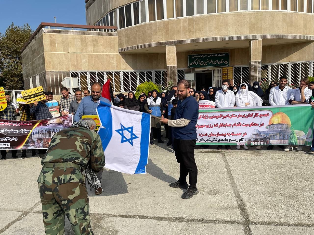 گوشهای از ابراز همدردی بیماران و کادر پزشکی بیمارستان پنج آذر با مردم فلسطین را مشاهده می کنید.