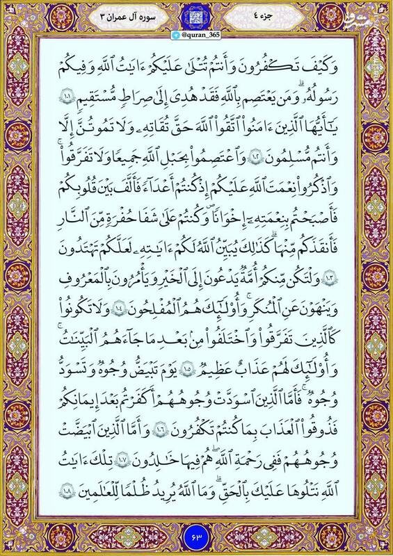 صبح خود را با قرائت آیاتی از صفحه ۶۳ سوره مبارکه آل عمران (جزء چهارم) نورانی کنید.