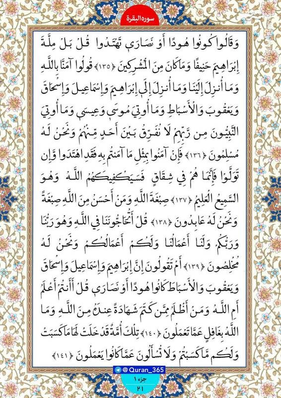 صبح خود را با خواندن آیاتی از صفحه ۲۱ از سوره مبارکه بقره (جزء اول)، آغاز کنید.