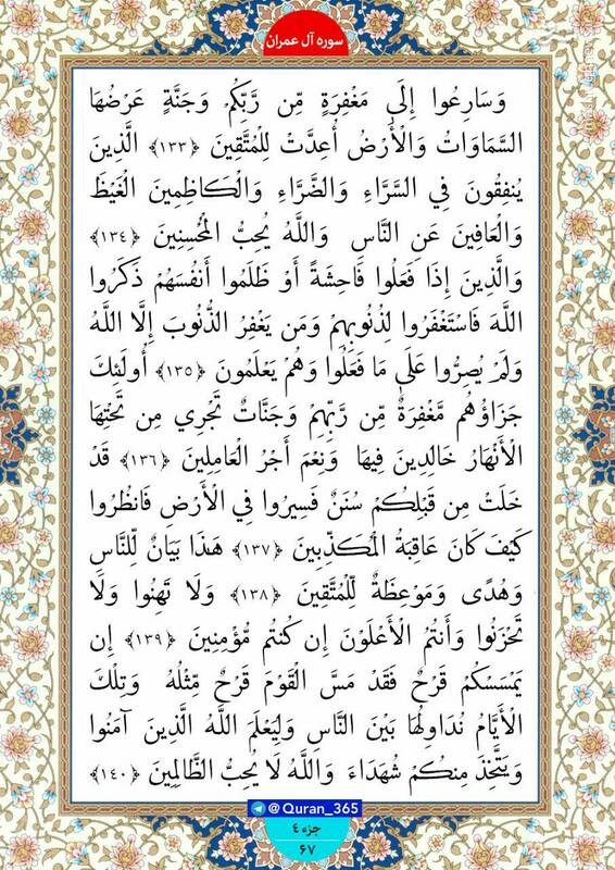 خانه‌های خود را با خواندن روزانه قرآن نورانی کنید امروز خود را با صفحه ۶۷ از سوره مبارکه آل‌عمران (جزء چهارم) روشنایی ببخشید.