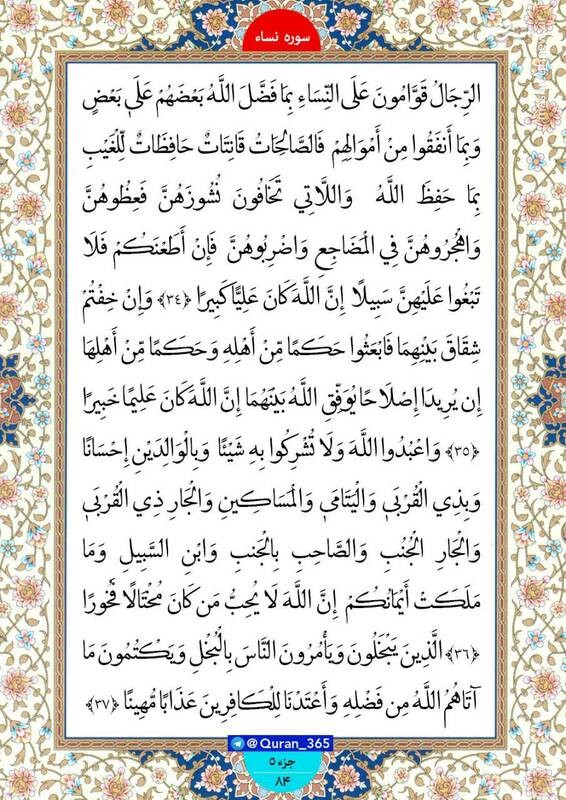 خانههای خود را با قرائت کلام وحی صفحه 84از سوره مبارکه نساء(جزء چهارم) نورانی کنید.