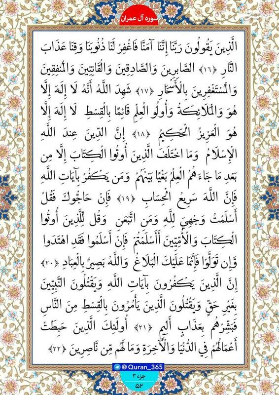 صبح خود را با قرائت آیاتی از صفحه ۵۲ از سوره مبارکه آل عمران (جزء سوم) شروع کنید.