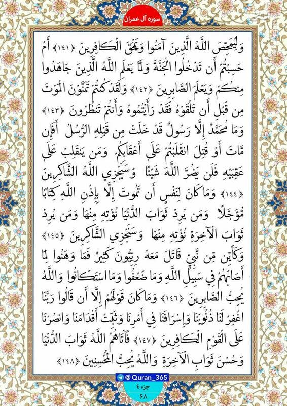 خانه‌های خود را امروز با خواندن صفحه ۶۸ از سوره مبارکه آل‌عمران (جزء چهارم) نورانی کنید.