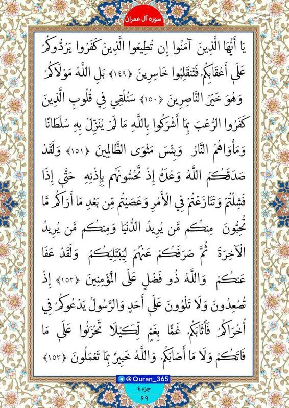 خانه‌های خود را امروز با خواندن صفحه ۶9 از سوره مبارکه آل‌عمران (جزء چهارم) نورانی کنید.