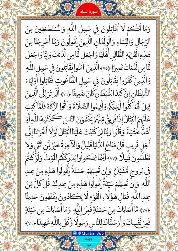 خانه‌های خود را امروز با خواندن صفحه 90 از سوره مبارکه نساء (جزء پنجم) نورانی کنید.