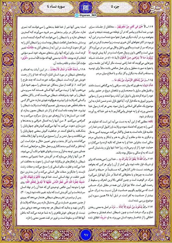 صبح خود را با قرائت آیاتی از صفحه ۹۷ سوره مبارکه نساء(جزء پنجم) نورانی کنید.