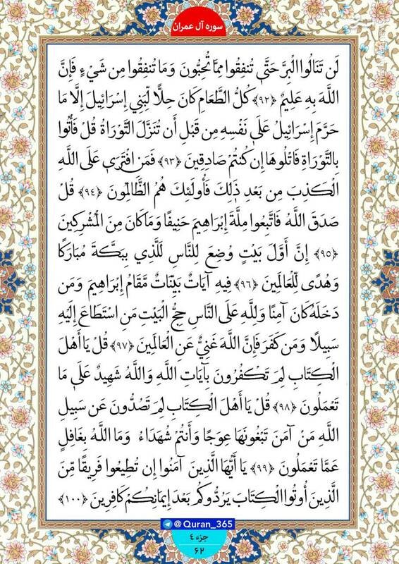 صبح خود را با قرائت آیاتی از صفحه ۶2 سوره مبارکه آل عمران (جزء چهارم) نورانی کنید.