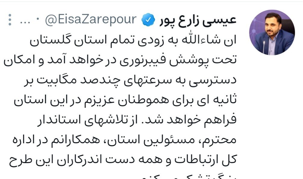 عیسی زارع‌پور در خصوص آخرین وضعیت فیبر نوری و آغاز افزایش سرعت اینترنت در استان گلستان در شبکه ایرانی ویراستی نوشت: ان شاءالله به زودی تمام استان گلستان تحت پوشش فیبر نوری در خواهد آمد و امکان دسترسی به سرعت‌های چند صد مگابایت بر ثانیه‌ای برای هموطنان عزیزم در این استان فراهم خواهد شد.