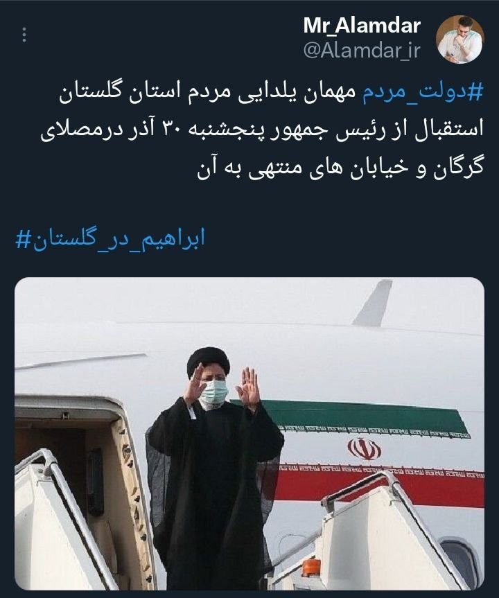 به گزارش خبرنگار پایگاه خبری تحلیلی «گلستان ما»، «آیتالله سیدابراهیم رئیسی» رئیسجمهور محبوب کشورمان در سفری دو روزه و در یکی از به یادماندنیترین روزهای سال یعنی آئین یلدا، مهمان مردم خونگرم گلستان است، آیتالله رئیسی ترجیح داد تا دولت کار و کرامت در طولانیترین شب سال هم «خدمت به مردم» را در «پایتخت اقوام» و از سرزمین برادری به تصویر بکشد و در میان مردم رفته و حرفها و مشکلات آنها را از نزدیک بشنود و بهترین تصمیمات را برای این استان شمالی اتخاذ کند تا گلستان به سان نامش نامدارتر شود، همزمان با این سفر هشتگ #ابراهیم_در_گلستان در فضای توییتر «داغ» شده است.