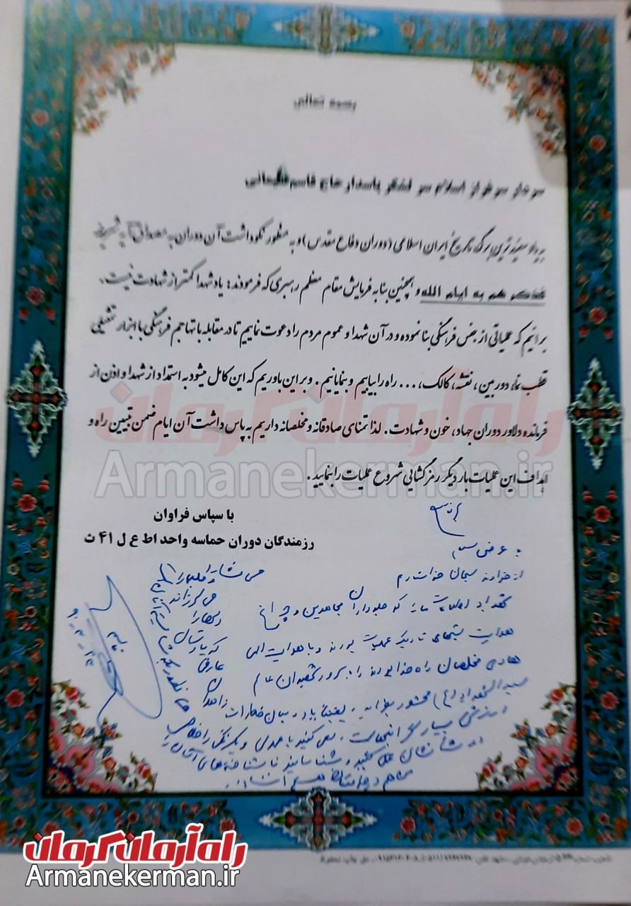 شهید سلیمانی در پاسخ به دعوت جمعی از رزمندگان واحد اطلاعات و عملیات لشکر ۴۱ ثارالله استان کرمان در دوران دفاع مقدس از ایشان، یادداشتی کوتاه به شرح زیر نگاشتند: