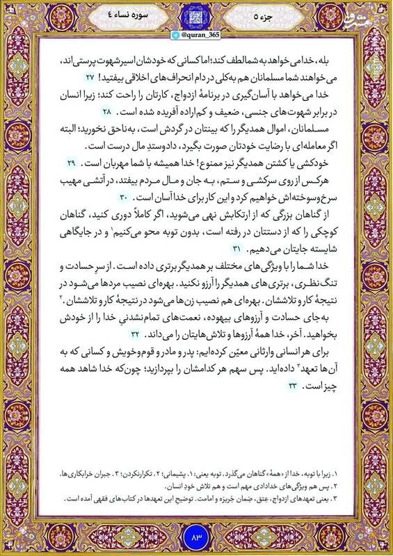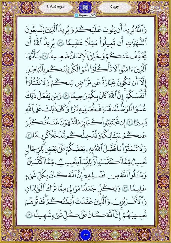 خانه‌های خود را با قرائت کلام وحی صفحه ۸3 از سوره مبارکه نساء(جزء چهارم) نورانی کنید.