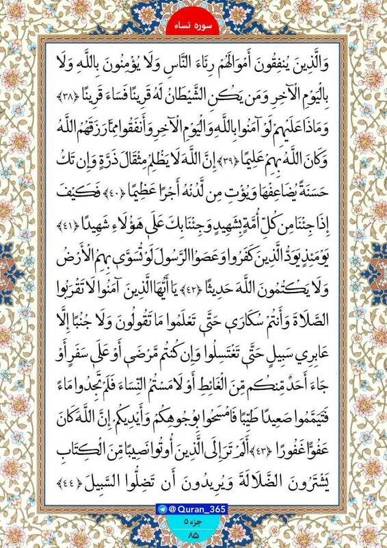 خانه‌های خود را با قرائت کلام وحی صفحه 85 از سوره مبارکه نساء(جزء چهارم) نورانی کنید.