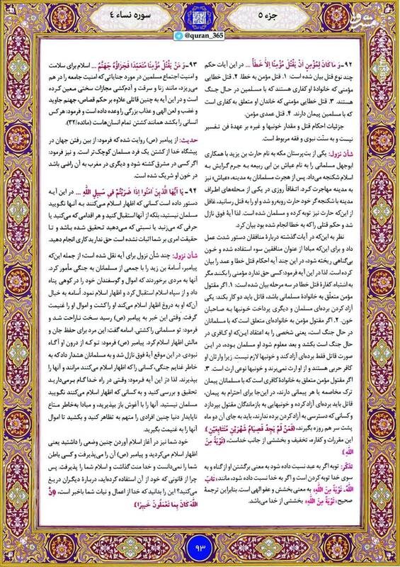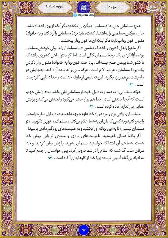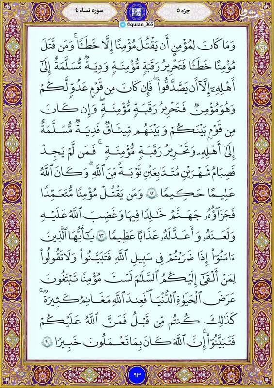 خانه‌های خود را با قرائت کلام وحی صفحه ۹۳ سوره مبارکه نساء(جزء پنجم) نورانی کنید.