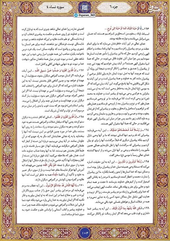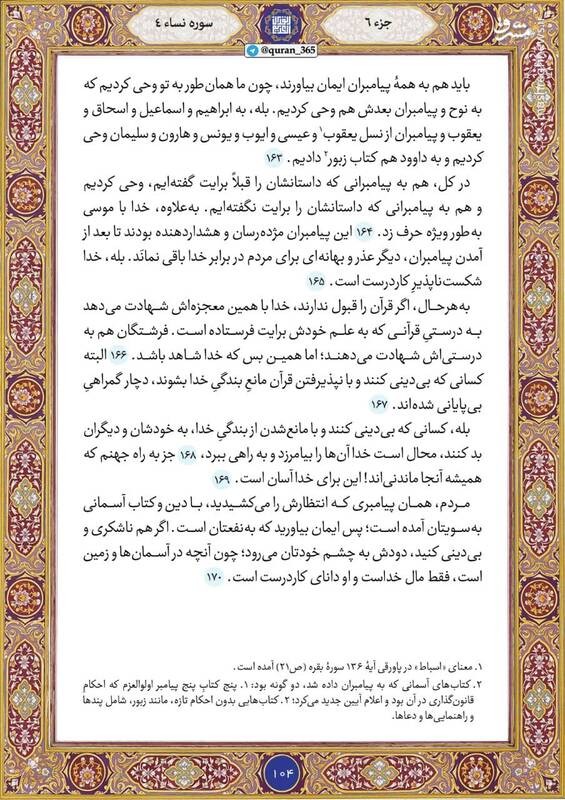 صبح خود را با قرائت آیاتی از صفحه ۱۰۴ سوره مبارکه نساء(جزء ششم) نورانی کنید.